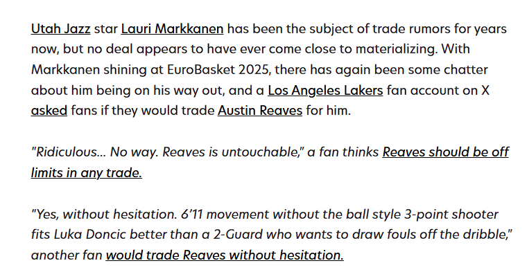 当然了,湖人队很可能不愿意送走八村垒。因此,这笔交易想要达成难度不小,加上马尔卡宁在24~25赛季的发挥一般,场均也才得到19分、5.9篮板、1.5助攻,更投出了职业生涯最差的42.3%的投篮命中率;但他在上赛季之前的赛季打出了职业生涯的巅峰表现,并且在欧洲杯的发挥相当出色。如果能够联手东契奇,湖人队的篮板球保护能力变强,整体进攻将会非常恐怖。